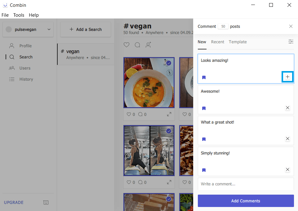 Selecting the “Analyze users when searching” option turns on Combin’s machine learning algorithm to identify and prioritize the accounts most likely to become loyal followers. You can also filter found accounts by locations, which could be very useful for local businesses.
