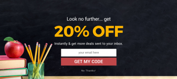 98% of traffic leaves your site without converting. By presenting website visitors with an email pop up, you can convert a higher percentage of bounce traffic. This justifies investment in paid traffic and enhances overall traffic conversion. You can also add an incentive like a discount to increase email opt-ins and also encourage shoppers to purchase that same visit. With the intent to buy during the back to school sales surge, an offer like the one below is perfect for both email capture and sales.