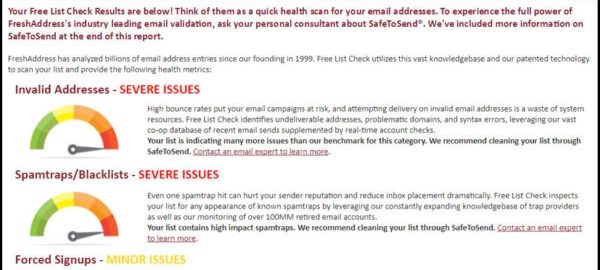 We created Free List Check to help you see quickly just how much of your email list passes the quality test. It’s easy to use, and you get results quickly. You’ll also get a taste of what it’s like to work with FreshAddress to clean up problem areas on your list – but, we promise, no sales pitch.