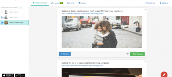 You can either schedule content straight from your recommendations feed, or favorite it and save it to a content library for future use. Additionally, you can also set up an RSS feed stream where you see posts taken from the RSS feeds that you attach to the app.