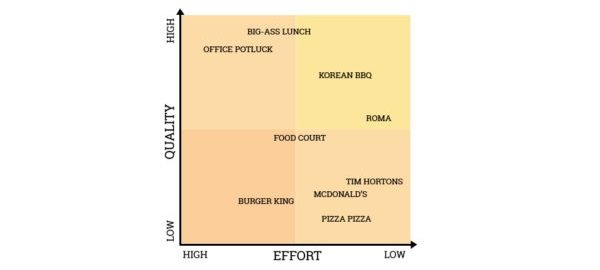 To effectively explain these methods, we need an example issue. To keep it simple, we’re going with something we’ve all experienced: trying to plan a team lunch. The parameters? We want something good, but we only have an hour to get it, eat it, and get back to work. With that in mind, this is the decision-making matrix we’ll use to plot our ideas.