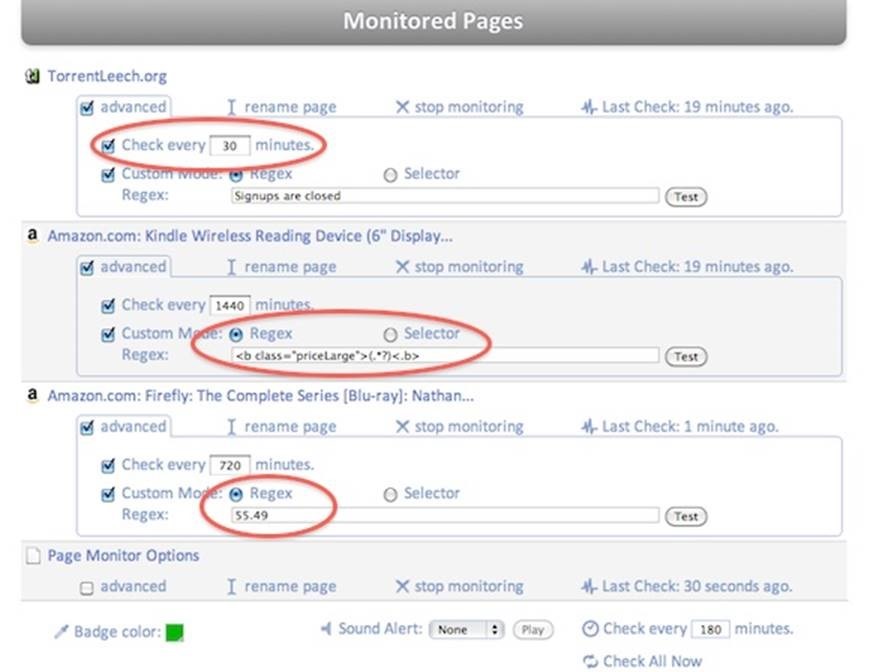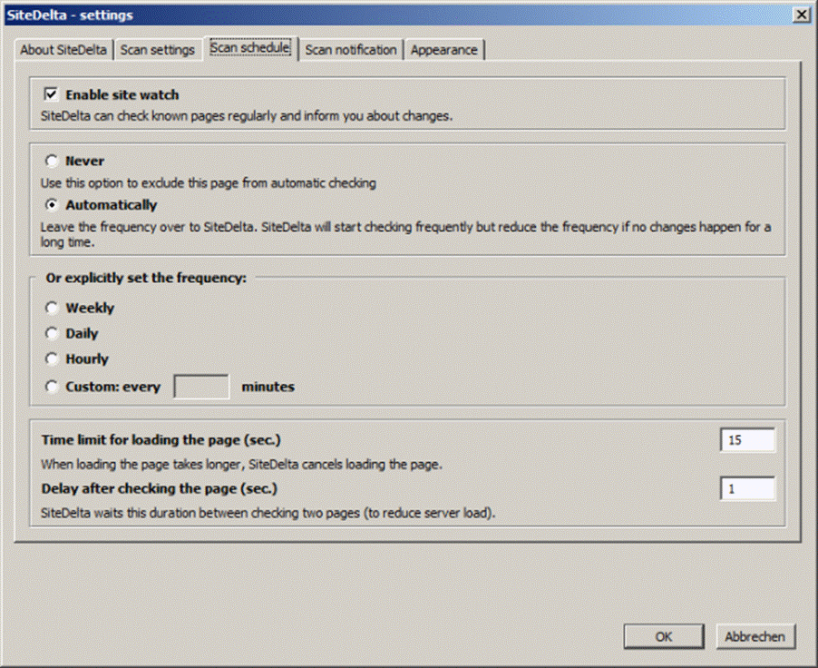 Scanning frequency defaults to 180 minutes, but you can set it as you wish. As changes are monitored using your own browsers, realize that checking for changes too frequently can affect your own browsing.