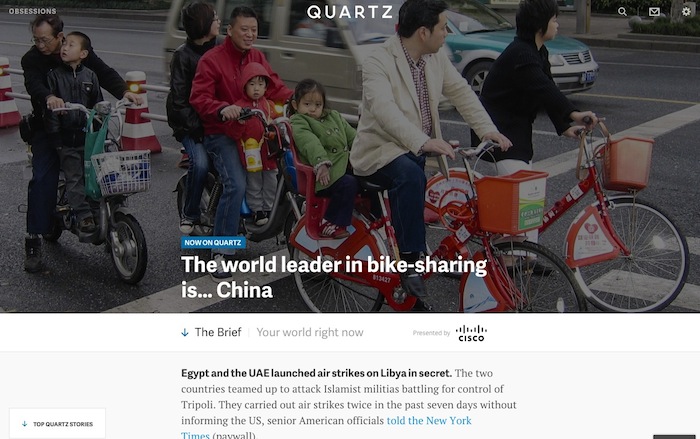 When the digital news property first launched in 2012, there wasn’t a home page. Visitors merely saw the top news story at that very moment (I’m guessing the logic was this: if a story was the most read across social media, it’d be the most compelling to those visiting qz.com).