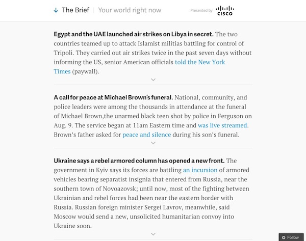 Two years later, Quartz pivoted and rolled out a more home page-like design that prominently featured a version of their popular Daily Brief email. It eschewed the river of headlines that greeted visitors in 2012 and served up a shortlist of top story summaries.