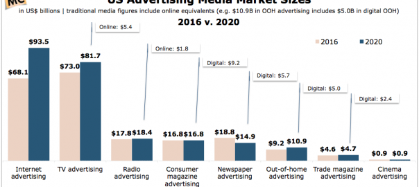 Many businesses still spend the lion’s share of marketing dollars on traditional media, despite the problems with such expenditures. Look at data below from Price Waterhouse Cooper projecting advertising spending in 2010 compared to 2016. Adding up all the numbers for traditional media versus digital, you see that advertisers still spend more money on traditional media, despite the uncertainty (and increasing doubt) that this is the best place to put their marketing dollars.
