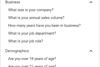 Google has additional questions too, but you cannot customize them. Instead, you have a list of question options broken out by specific industries or categories. You can add multiple qualifying questions to your lead forms to get more information form your users. Many of them are multiple choice, so if a user doesn’t see the option that describes them in their questions, they most likely will not fill out the form.
