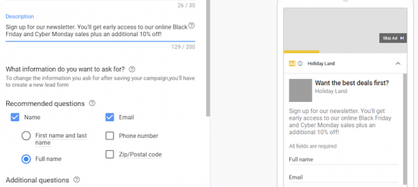 As with the first two holiday video ad strategies (shopping campaigns and sitelink extensions), lead form ads are also only available for advertisers running TrueView campaigns—TrueView for Action campaigns, specifically.