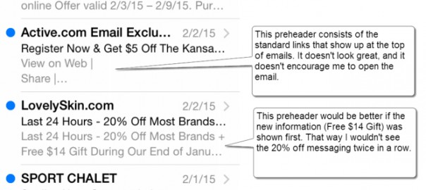 The preheader is defined by your users’ email clients, and it comes from whatever text appears at the top of your email. As shown below, sometimes this works for you, and sometimes it works against you.
