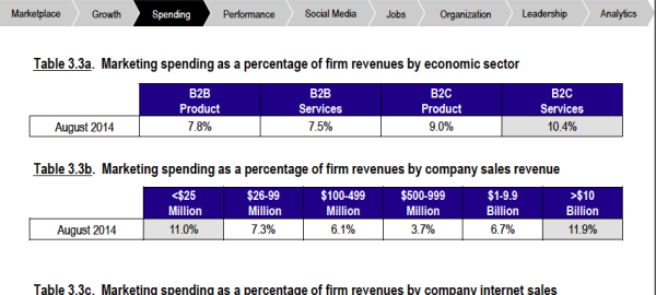 - How much should we be spending on marketing? It’s a classic question and a favorite of CEO’s everywhere. The mere mention of it is enough to stop marketers in their tracks. Fortunately, the AMA, McKinsey and the Duke Fuqua School of Business have got your back with their 2014 CMO Survey. Section 3 of the report contains data from 350 marketers on their spending from digital to people and programs. The research even breaks spending out by size of company, type of company (B2B or B2C, and B2B products or services). The report is packed with valuable information — it’s a “must have” for any marketer this year.