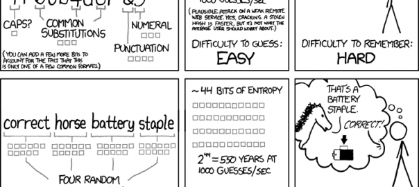 The problem with long passwords is that they can be hard to remember. One trick is to choose a password consisting of three or four random words strung together. For instance, take the words “correct” followed by “horse”, then “battery” and finally “staple” and put them together to make the super strong password “correcthorsebatterystaple”. Since these are four actual words, it makes it easier for you to remember, while being virtually impossible for a hacker to guess and also very challenging for a random password generating program to crack with brute force.