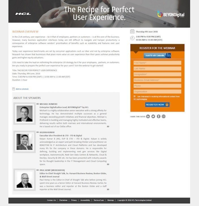 - Don’t try to shoehorn your services into the call to action. Products and offers can come at a later time. The landing page intends to get people to sign up for your webinar. Don’t scare them off by trying to pitch a product at the eleventh hour.