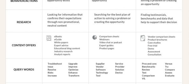 There are numerous resources to help you with developing the buyer’s journey for each of your personas. After you have completed both, you are ready to audit what content you have and how that helps each persona in all three stages of their journey.