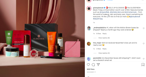 While you can certainly place a lot of related Instagram hashtags at the end of your captions, it’s also worth looking for how you can place them naturally throughout the caption text, along with @mentions of relevant people, like @GlossyboxUK does here: