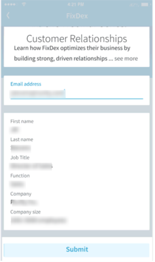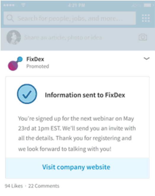 When someone clicks on the ad, it shows the in-app pre filled form with information from their profile. All the user needs to do is to confirm the information and submit. Below is a sample LinkedIn Lead Generation Ad with the form.