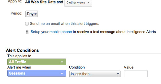 A really important alert to have, as this will notify you when there’s a serious error with your site, or if there’s a glitch between your site and its GA. Either way, you’ll want to know ASAP. The configuration for this is very simple, and looks like: