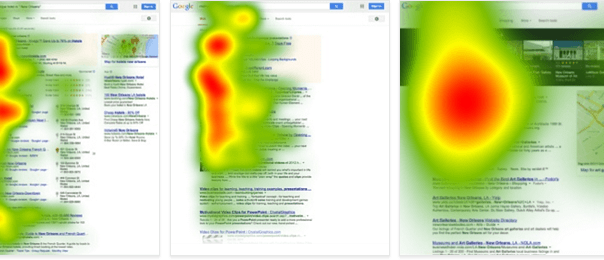 Let’s take a look at three different SERPs. One has a local pack; one includes a paid ads pack; and one shows a carousel. The heat map shows how the views and clicks are distributed: