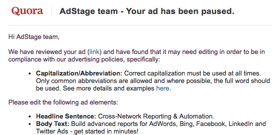Quora’s ad policies are different from AdWords’ or Bing’s. They have high standards for their ads and expect them to be as high-quality as the content they appear alongside. That said, all ads must adhere to Quora Ads content policies and guidelines and should be clear, well-formatted and free from grammatical, capitalization and punctuation errors.