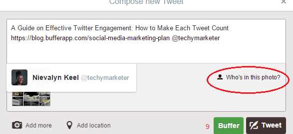 - Images: It’s widely reported that tweets with images have a higher engagement rate, than tweets without. Add something more to your timeline and by including a relevant image, gif, or video. Use the Who’s in this photo? feature to further engage with other users.