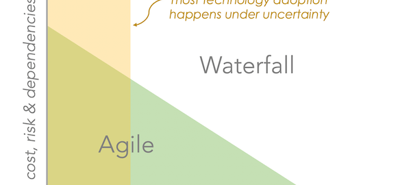 Adoption costs are often a driving force behind our methodologies, noted MarTech conference chair and Hubspot vice president of platform ecosystem Scott Brinker. “In situations where you face higher costs to adopt — especially if the cost for even the initial adoption is high — or there are greater risks or dependencies around adoption, then the waterfall model is probably a better fit,” he wrote in a blog post this week. “The stakes are higher and test-and-learn is less appealing. But there is a second axis to consider: certainty, or rather, uncertainty.”