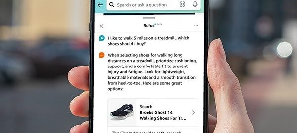 Rufus can answer questions in the Amazon Shopping app such as why an order is late, even if the consumer misspells the product name. By tapping an icon in Amazon’s smartphone apps, shoppers bring up the interface and can text questions or voice chat with the AI — such as “I like to walk 5 miles on a treadmill, what type of shoes should I buy?”