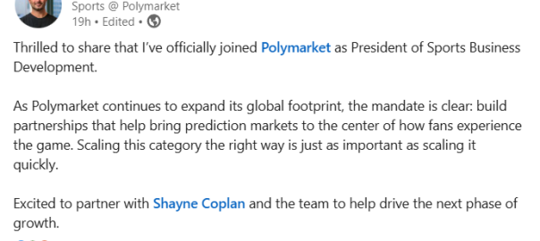 On Thursday (February 19), Polymarket confirmed it had brought Borod on board as president of its sports business development division, locking in a hire that had already sparked a legal showdown. In a statement on LinkedIn, Borod stated: “As Polymarket continues to expand its global footprint, the mandate is clear: build partnerships that help bring prediction markets to the center of how fans experience the game. Scaling this category the right way is just as important as scaling it quickly.