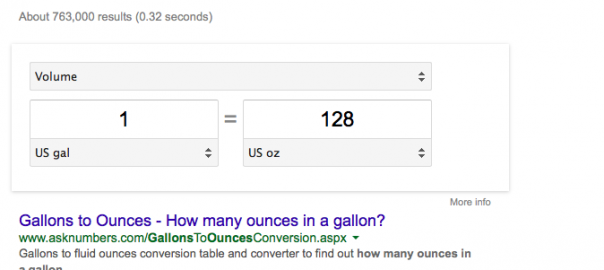 Have you noticed Google is supplying answers to questions right on the search page? If you type in, “How many ounces in a gallon?” the conversion comes right up. You don’t have to click on any website to find the answer. This feature, which Google calls Instant Answers is handy, but it can have an adverse effect on your company’s website traffic. Here’s what the instant answer to our question looks like: