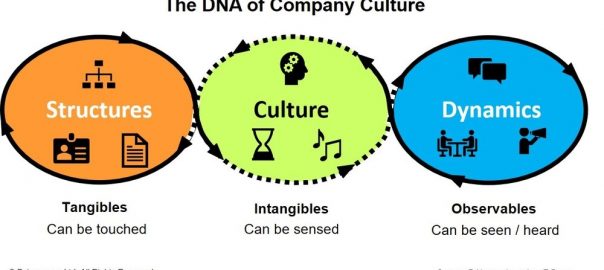 The concept is that culture is an output of the interplay between the ‘structures’ within a company and the ‘dynamics’ of the people within it. By structures, I’m not talking of the buildings or space, although these are included, I’m primarily talking about tangible things like organisation charts, policies, documented procedures, appraisals, training, job descriptions, etc. Stuff you could put your hand on, should you so desire. Dynamics looks at how you can see people behaving in the company.