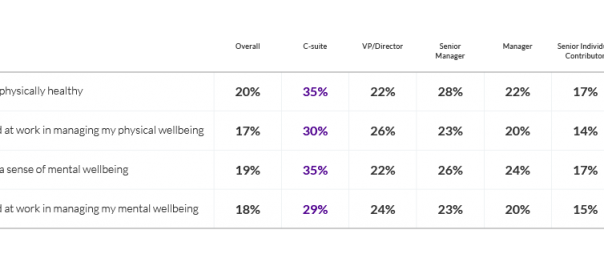 According to our research, senior leaders are most likely to feel healthy, but are also more likely to have taken stress leave. More specifically, C-suite leaders are twice as likely as junior independent contributors to say they feel physically and mentally healthy and are almost twice as likely to have taken stress leave.