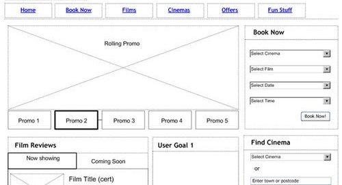 Check out this wireframe to see how you can build a website to convert visits into sales. Note how the wireframe includes multiple promotions to motivate conversion as well as goals featured prominently on the home page. Other elements on this page reflect standard UX design best practices by allowing users different tools to search for just the product they want — in this case a film at a theater. The page also offers a star rating for films to help visitors make decisions about which films they might enjoy.