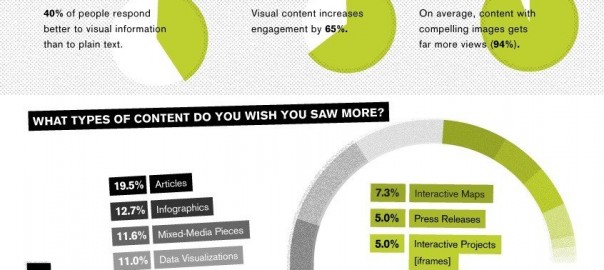 Get visual with it: Just like the infographic below, people respond and engage with visual content because we are visually-geared animals. Visual content increases engagement by 65 percent and content with compelling images gets drastically more viewed.