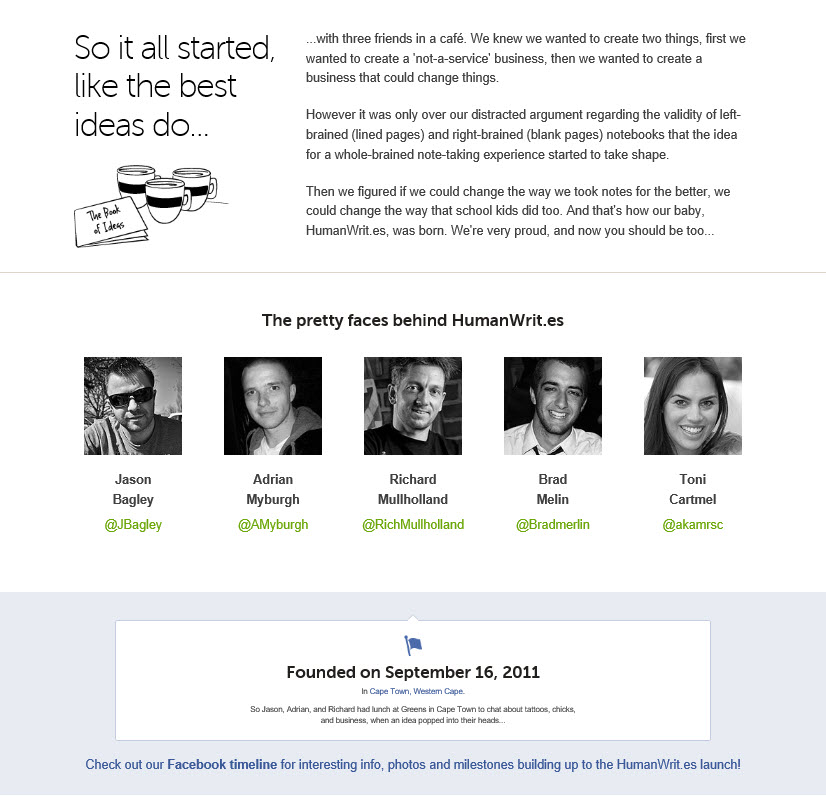 HumanWrit.es is a small, South African company selling notebooks. Sounds boring, right? Somehow, through an endearing About Us page, the founders connect with their audience authentically while sharing their motivation for the product. By putting employees’ pictures and social media accounts on the site, it also provides an easy point of contact and opportunity to share through Facebook and Twitter! Plus, I love the manifesto.