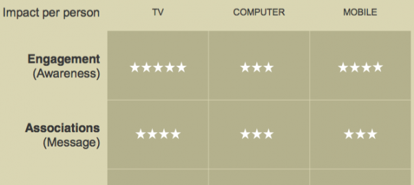 Now, a couple more words of wisdom: You can create ads within an email that are engaging, and that ask questions that require a clickable response. That said, it’s about asking the right questions and doing so within the first few seconds of your video, otherwise a viewer might be more resistant to responding or engaging. Furthermore, brand integration in the first few seconds of your video is vital, and shorter ads/video are always better. See below for how TV, Computer and Mobile stack up in terms of impact per person, and try to create campaigns that speak to all three mediums 🙂