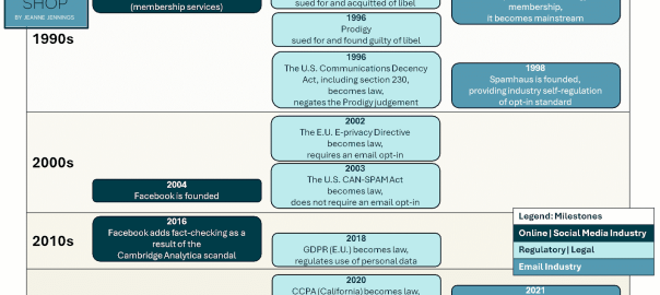 To understand the current situation, it’s helpful to review how we got here. Below is a timeline of milestones across social media, email marketing and regulatory/legal/restrictive events since the 1990s.