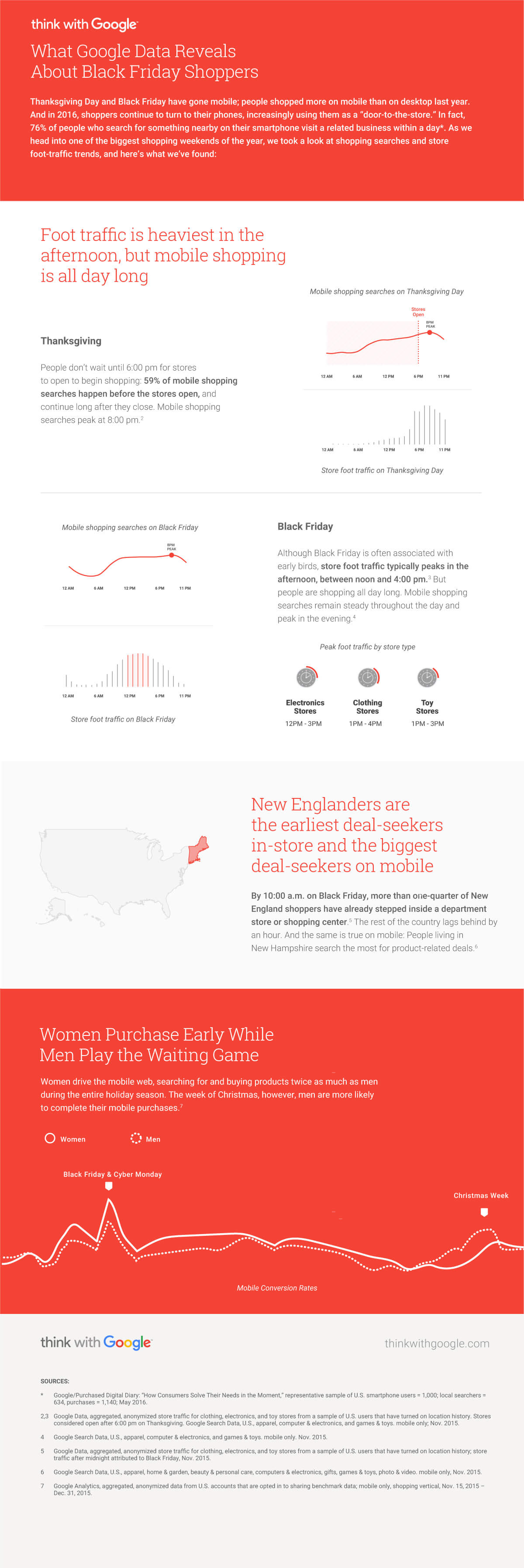 According to Google, on Thanksgiving Day last year, 59 percent of mobile shopping searches occurred before 6 p.m., when many stores opened their doors and in-store foot traffic started to pick up. On Black Friday, in-store foot traffic peaked between noon and 4 p.m. See the infographic below for more insights on Black Friday shopping.