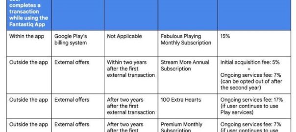 Google included the following chart to show how the fees will apply to a hypothetical “Fantastiq App”: