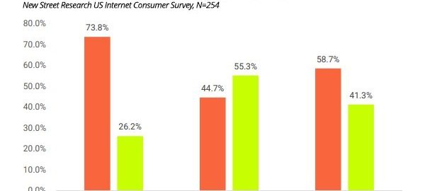 New Street Research surveyed 263 U.S. consumers on a census-weighted basis for their search and AI chatbot usage habits, noting that the analyst firm follows stocks of Google’s parent company Alphabet and Facebook’s parent company Meta.