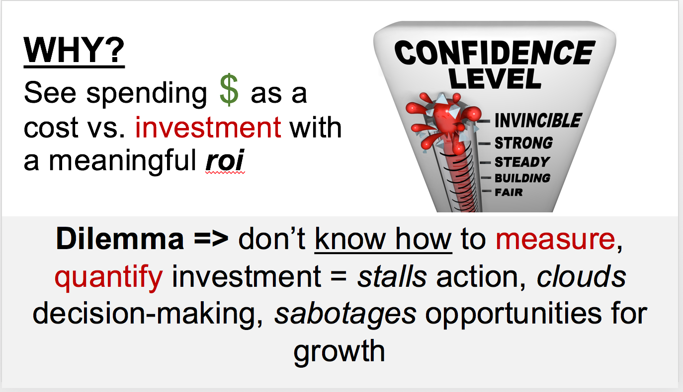 Many leaders hesitate to invest in this way because they don’t know how to calculate or apply relevant numbers to performance or determine ROI, even when they do begrundingly decide to invest.