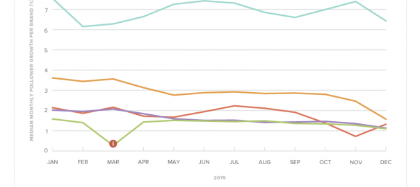 1. Instagram follower growth is explosive. On average, brand follower growth on Instagram increases by 6 percent to 8 percent month-over-month. That’s twice the monthly follower growth rate on LinkedIn and more than three times the monthly follower growth rate on Facebook, Twitter, and Pinterest. Annually, brands saw 100 percent median follower growth on Instagram, surging from 11,000 followers on January 1, 2015 to 22,000 followers by January 1, 2016.