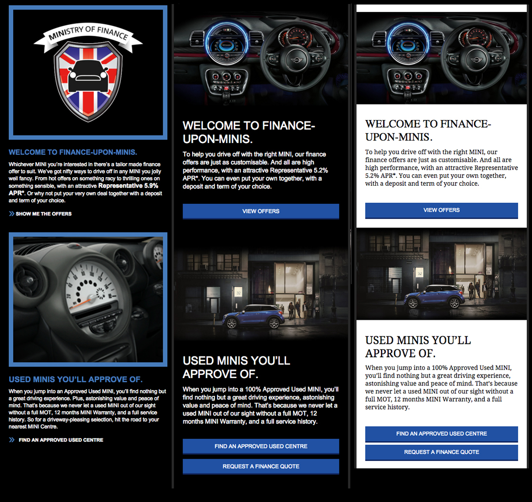 Looking at the images above you will see in the first version the large boxed CTA and the range of cars. On mobile this doesn’t change apart from the range becoming a bit smaller and the space becomes more difficult. The newer versions have kept a similar approach for desktop apart from the car names being live text. However on mobile these now all completely stack individually to the width of the screen and, to save the email becoming needlessly long, the range is hidden within a hide and show accordion which can be controlled by a button.