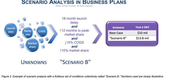Sometimes two or more assumptions are closely correlated. For example, an R&D investment that increases COGS may result in an earlier launch date (i.e., decreased time to launch) and increased market share. In such instances, those business plans should include scenario analysis, which basically asks the question, “But what if… and… and…?” Whereas sensitivity analysis sequentially adjusts individual assumptions, scenario analysis simultaneously modifies multiple assumptions (as depicted in Figure 2).