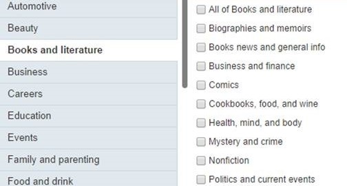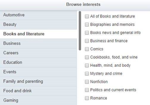 – A slightly less-specific version of Keyword targeting, Interest targeting permits you to select Interest groups that have been predetermined by Twitter. Twitters two-level hierarchical targeting options allow for you to get pretty specific ” for instance, within the broad Books and literature category, there are several more specific genre/category options, like Cookbooks or Romance. Interest categories are a great option if youre looking for a broader reach.