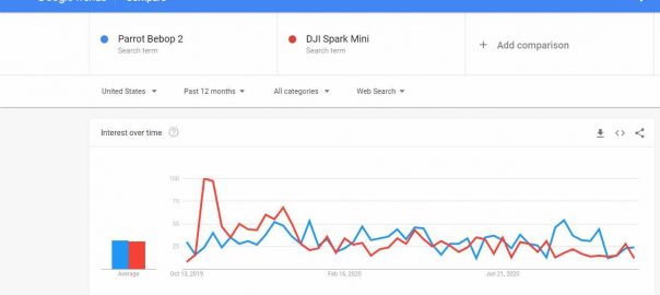 If you had an online store selling mini drones and you were considering selling the Parrot Bebot 2 Mini but you wanted to compare search volumes of your current bestseller the DJI Spark Mini, you could use Google Trends to compare the search volumes of the two products.