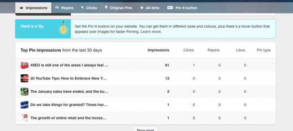 - Your Website Analytics – this links with your website and allows you to monitor the pins from your website