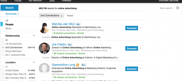 For example, if you’re working in online advertising, you might try searching for “online advertising” and then filtering by second-degree relationships.