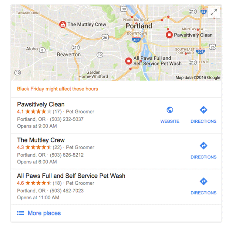 The “3 pack” is the most coveted real estate of local SEO. When someone searches for a location-related keyword, (e.g. dog groomer Portland), it’s the 3 first listings that show in local search results: