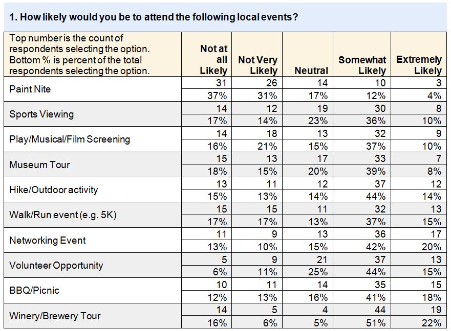 For example, when rating their likelihood to attend a Paint Nite, only three respondents (four percent) were “Extremely Likely” to attend.