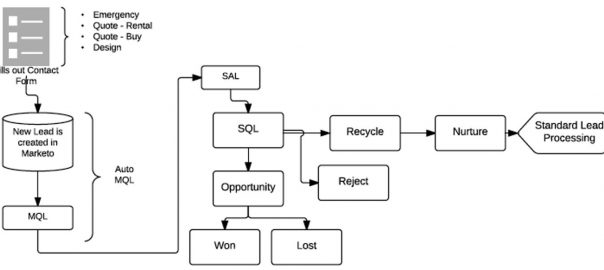 You can see from this graphic that the marketing automation platform plays a central role in the integration of your technology and the life of your lead. Once a new lead is created in the MAP, it is dynamically passed between Marketing and Sales as it is nurtured, potentially recycled, and either won, lost, or rejected.