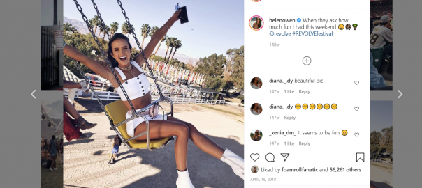 In this example, influencer Helen Owen promoted the REVOLVE Festival. Influencer promotion doesn’t end once the event starts. Here, Helen wore Revolve clothing while she enjoyed herself at the Festival. She continued to raise awareness about the event, garnered more followers for the brand, and may have convinced people to attend the next festival when it returns.