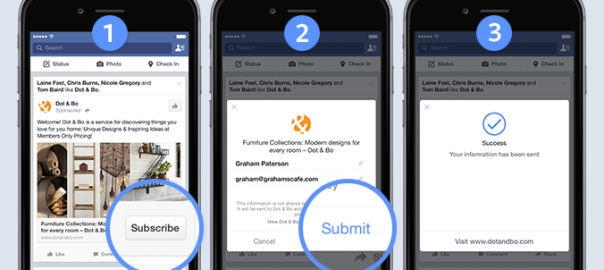 These are quite a bit newer, having been announced in June of 2015 and rolling out to everyone in October. Facebook Lead Ads allow you to capture a user’s information without the need for them to fill out a form. Here is an illustration of the process: