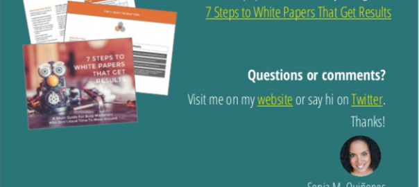 Content marketer Sonia Quinones placed a link to a landing page at the end of her SlideShare deck about creating white papers.